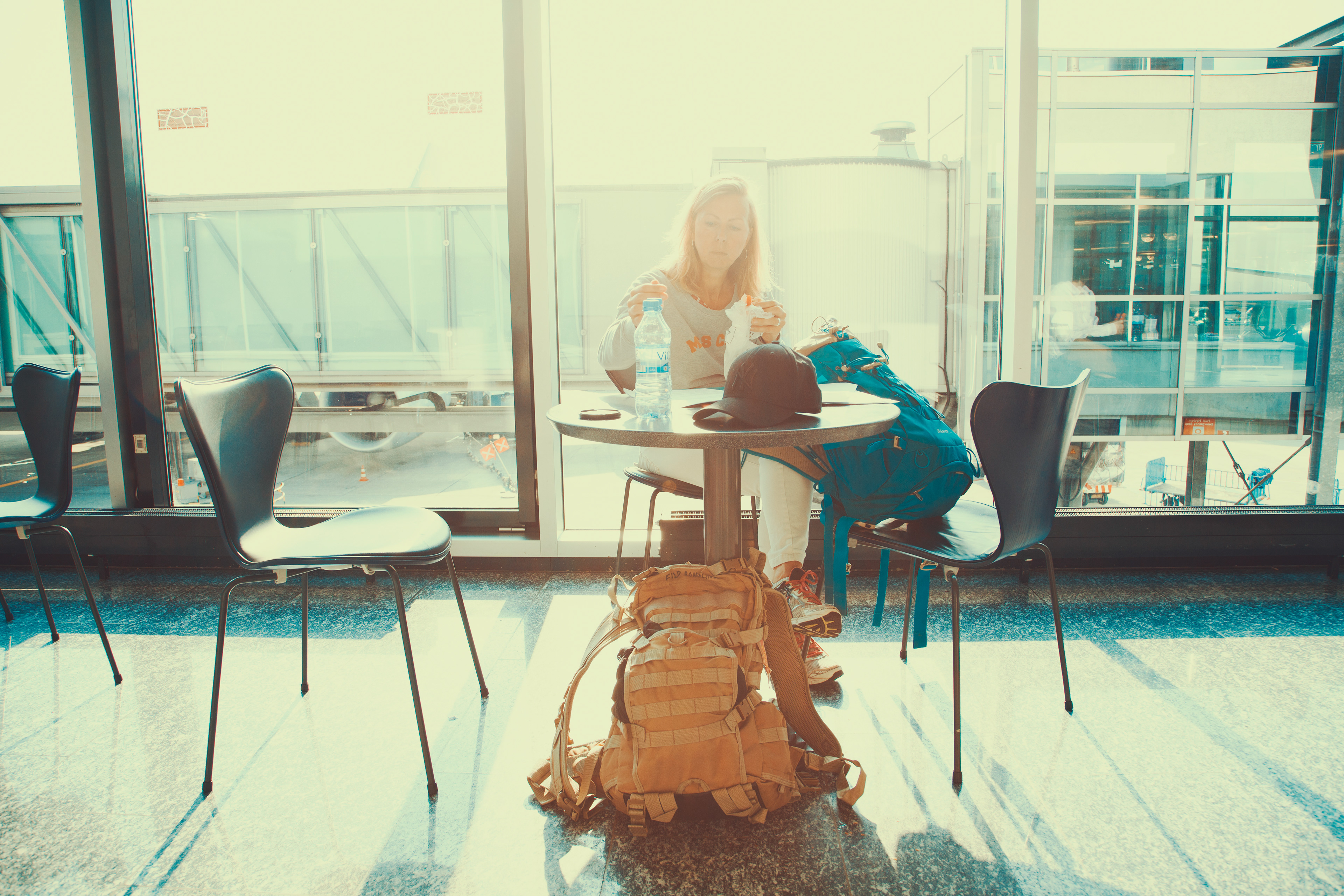 This is my mother at the airport. We are on our way to Italy to climb to the Margherita Hut at the top of Monte Rosa ^4554m